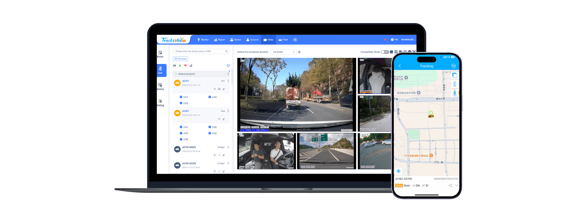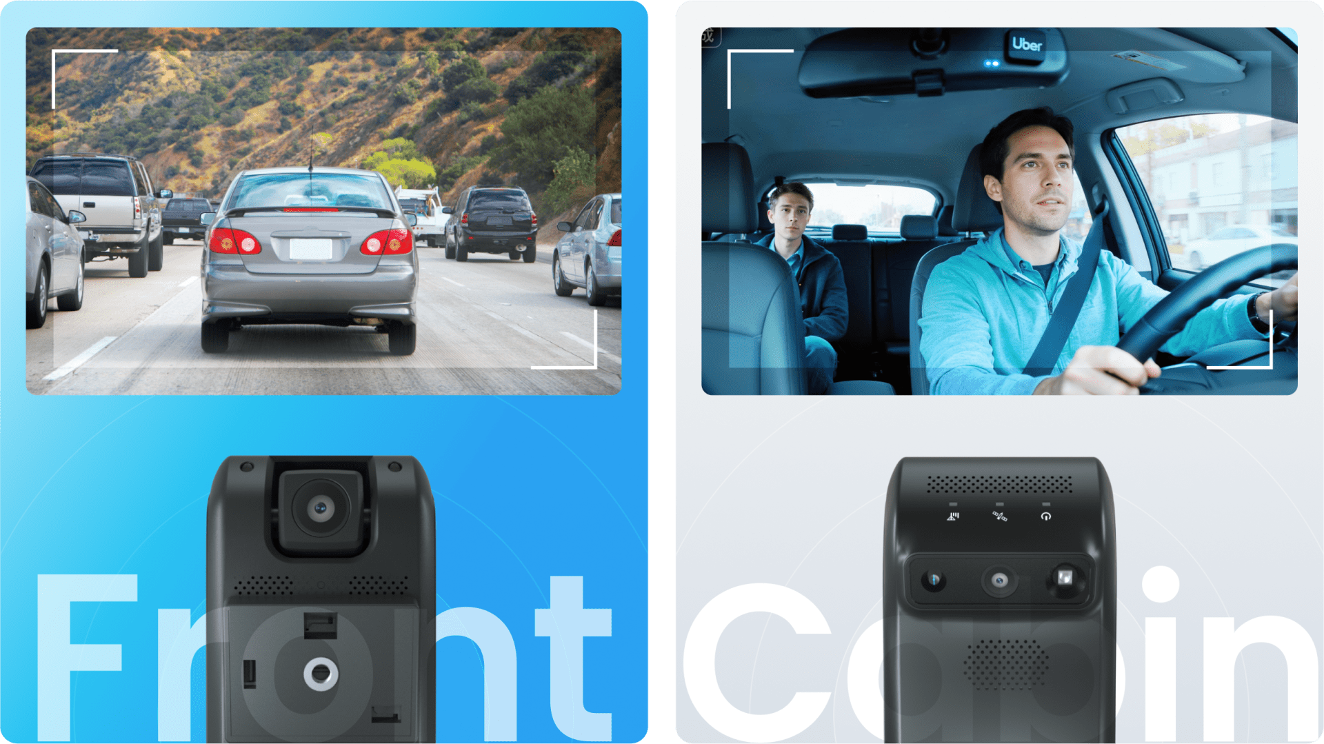 Simultaneously monitor the road ahead and what happens in the cab in real-time through the two on-device lenses, with no peripheral camera needed.